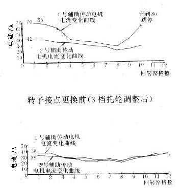 用輔助傳動時(shí),1號輔助傳動電機(jī)電流由15A迅速上升到38A;2號輔助傳動電機(jī)電流由11A迅速上升至58A。開至11~12格時(shí),1號輔助傳動電流上升至85A,2號輔助傳動電流上升至44A,隨即跳停(維持?jǐn)?shù)秒)。后又多次用輔助傳動和將主傳動電流調(diào)至1500A,窯仍不能起動。經(jīng)有關(guān)人員會診,認(rèn)為3檔托輪處的大小齒輪頂間隙過小,打開觀察孔看到該處大小齒輪在左側(cè)靠主減速機(jī)端30°下方,有卡死無頂間隙現(xiàn)象。其頂間隙變小的主要原因是因幾個月來一直用電動沙輪打磨3檔輪帶凸凹帶造成的,而慢轉(zhuǎn)窯是使其激化的主要原因。隨后調(diào)3檔托輪,將齒頂間隙調(diào)至5~6mm,并調(diào)整了1檔和2檔托輪,再用輔助傳動轉(zhuǎn)窯時(shí)1號輔助傳動電流zui大值是60A,2號輔助傳動電流zui大值是37A。1號輔助傳動zui大電流值下降15A。但是,兩者的傳動電流值偏差太大。交換1號和2號輔助傳動轉(zhuǎn)子回路的接線,電流值也隨之交變。確定為輔助傳動油浸電阻箱動靜接點(diǎn)有問題。打開電阻箱,發(fā)現(xiàn)其靜動接點(diǎn)燒壞較多,更換接點(diǎn)后,兩輔助傳動電機(jī)的電流偏差僅2A左右,屬于正常范圍,有關(guān)數(shù)據(jù)見圖3。此時(shí),1號輔助傳動zui大電流38A,2號輔助傳動36A,仍然在11~12格之間出現(xiàn)。這樣回轉(zhuǎn)窯用輔助傳動轉(zhuǎn)2h后,于4月28日早6點(diǎn)05分重新點(diǎn)火進(jìn)入正常運(yùn)轉(zhuǎn),以使回轉(zhuǎn)窯在冷態(tài)下的變形彎曲在熱態(tài)時(shí)自動恢復(fù)。