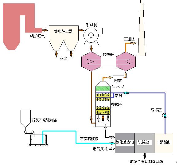 一、濕式石灰(石)/石膏法煙氣脫硫技術,其工藝流程圖如上: 鍋爐煙氣在吸收塔內與石灰(石)粉形成的漿液進行逆流接觸反應。吸收塔下段低PH值有利于氧氣和石灰石溶解,上段較高PH值有利于吸收反應,提高脫硫效率。